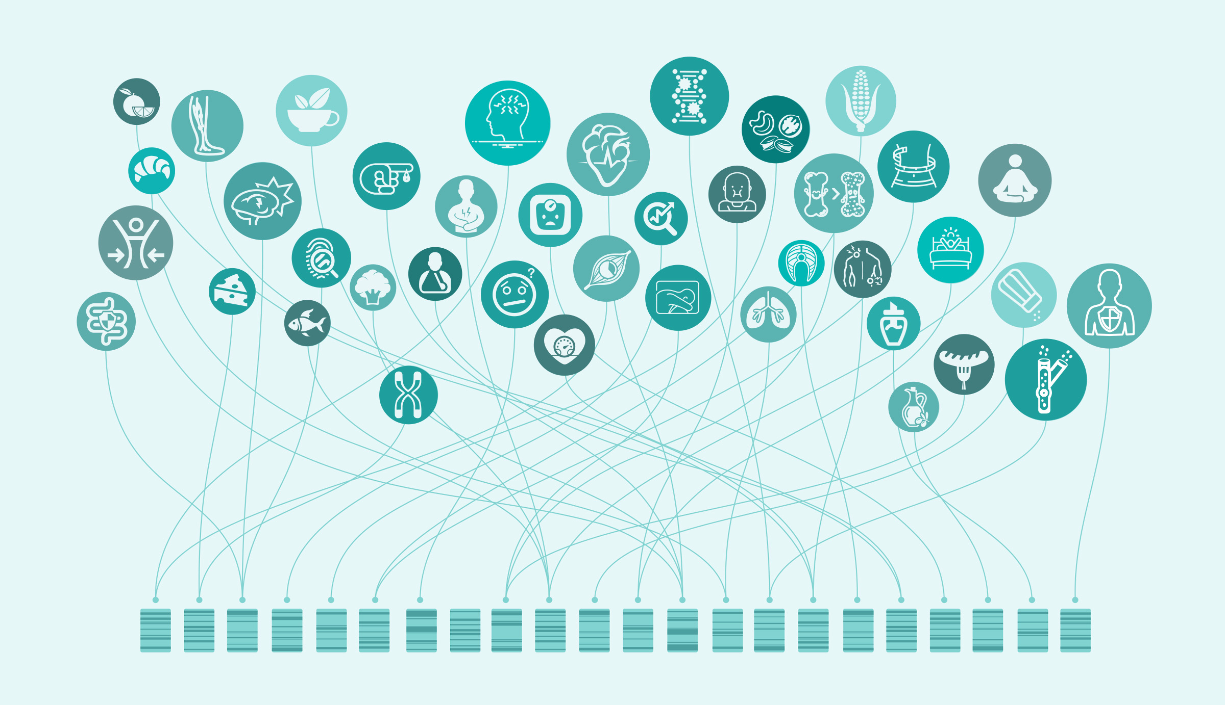 For each of the genetic predispositions detected by the test, a corresponding icon was designed to visualise the predisposition concept. That resulted in the creation of an icons bank.