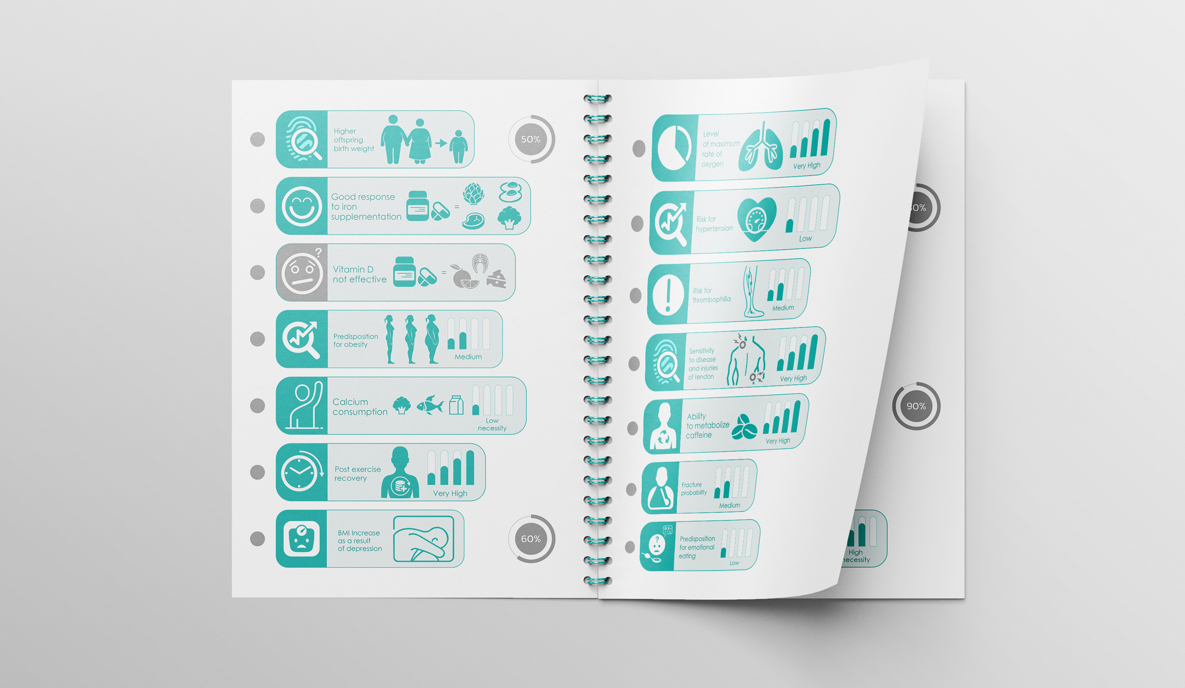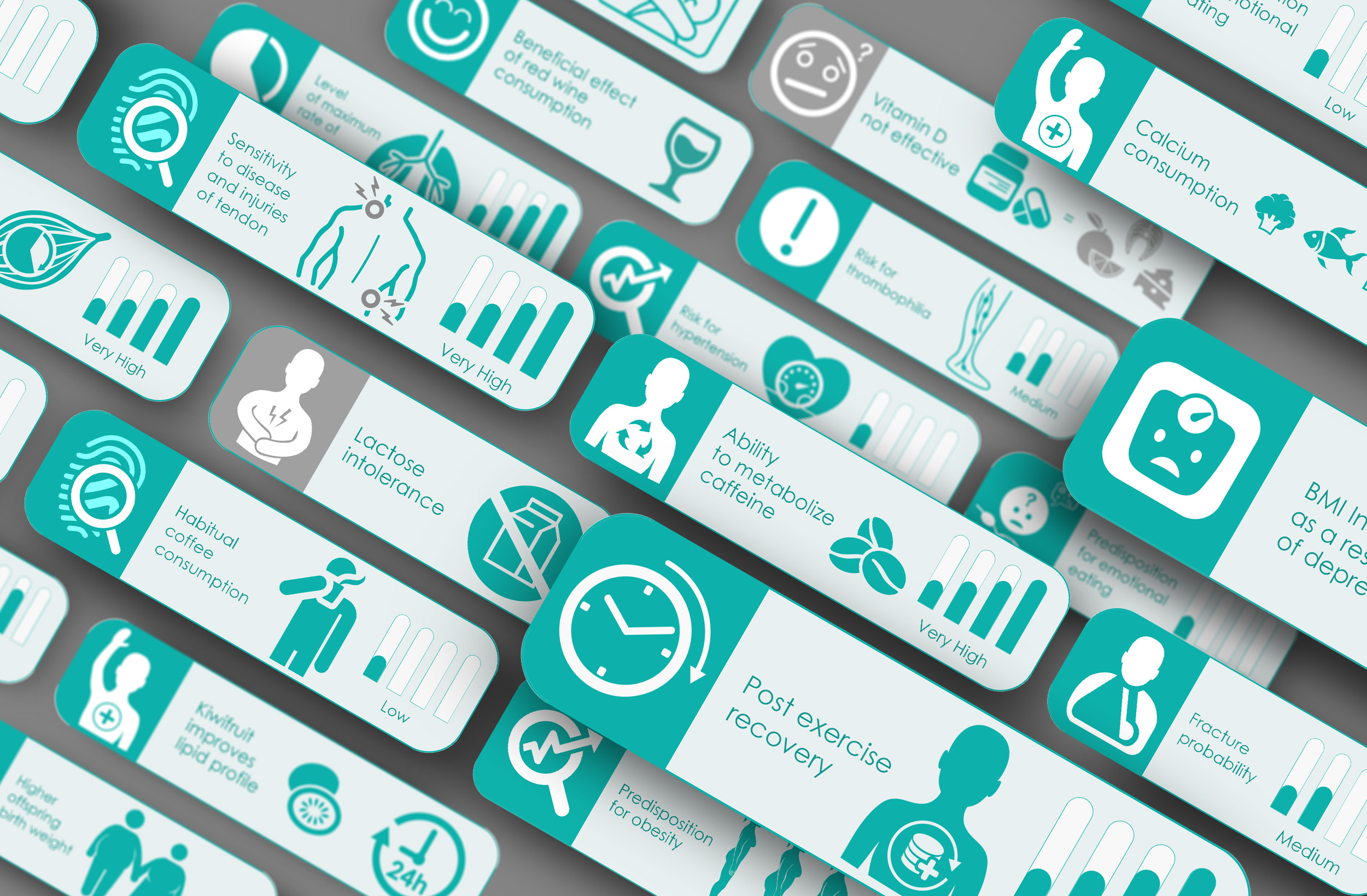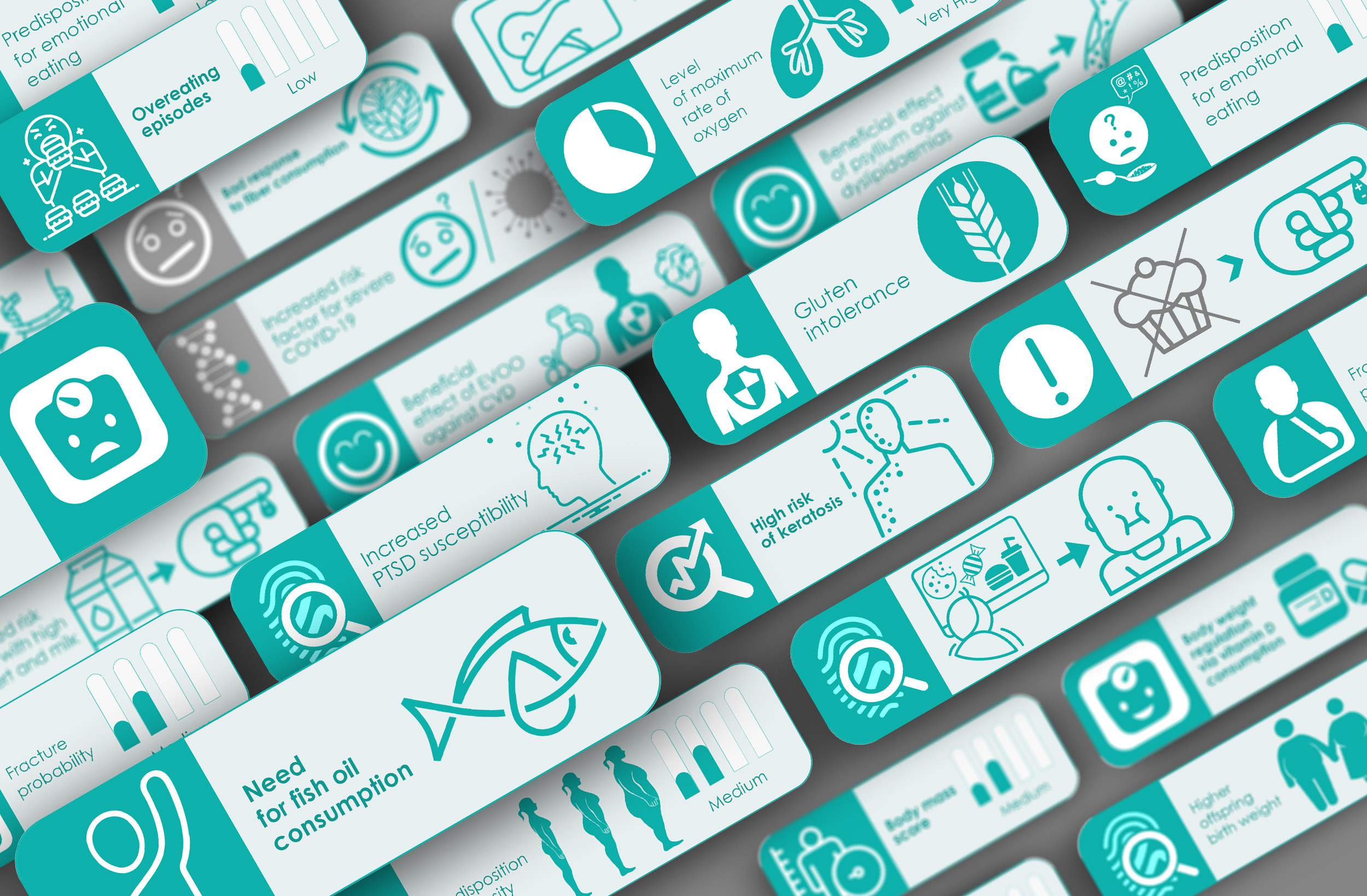 The aim of this project was the creation of a modern and direct visual language that connects with the genetic characteristics of each individual and the results are presented through infographics. This way, complicated genetic terms are simplified through the icon and are easily perceived by people of all ages. Furthermore, these icons aid health professionals to efficiently give guidance to their clients.
