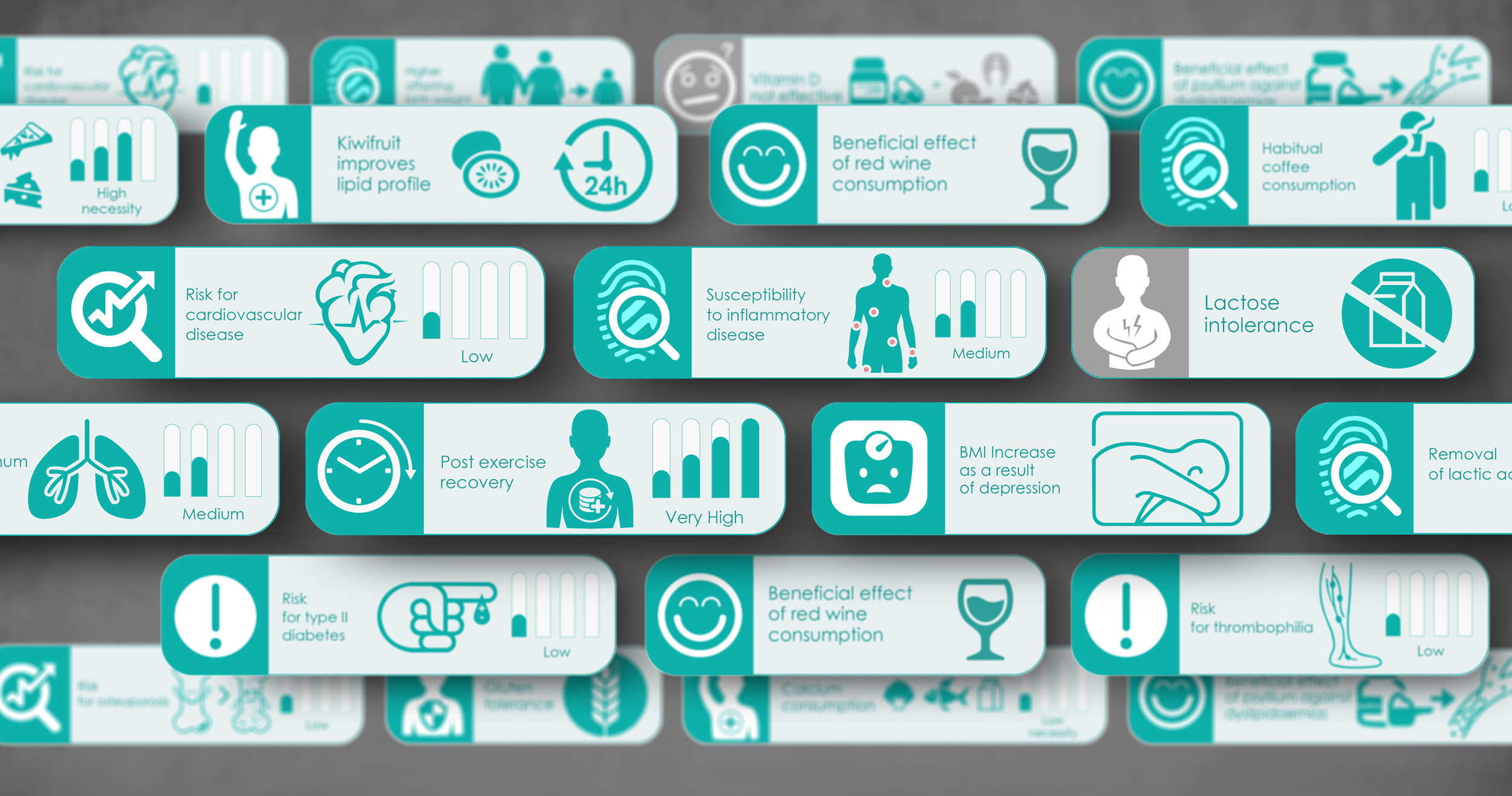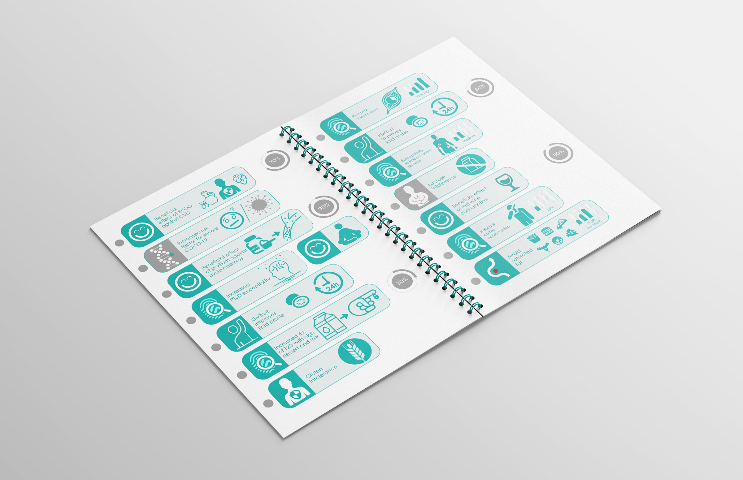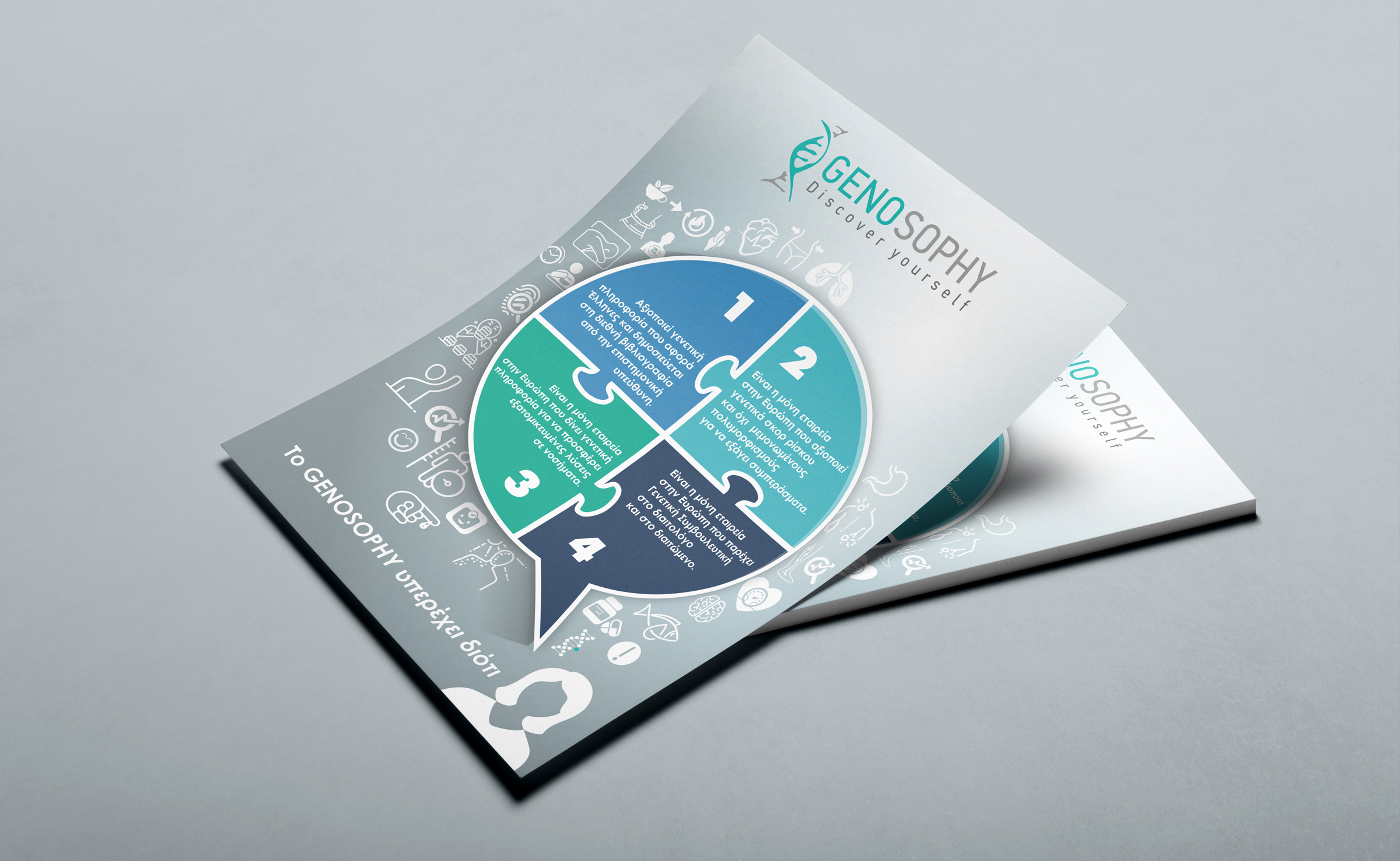 The aim of this project was the creation of a modern and direct visual language that connects with the genetic characteristics of each individual and the results are presented through infographics. This way, complicated genetic terms are simplified through the icon and are easily perceived by people of all ages. Furthermore, these icons aid health professionals to efficiently give guidance to their clients.