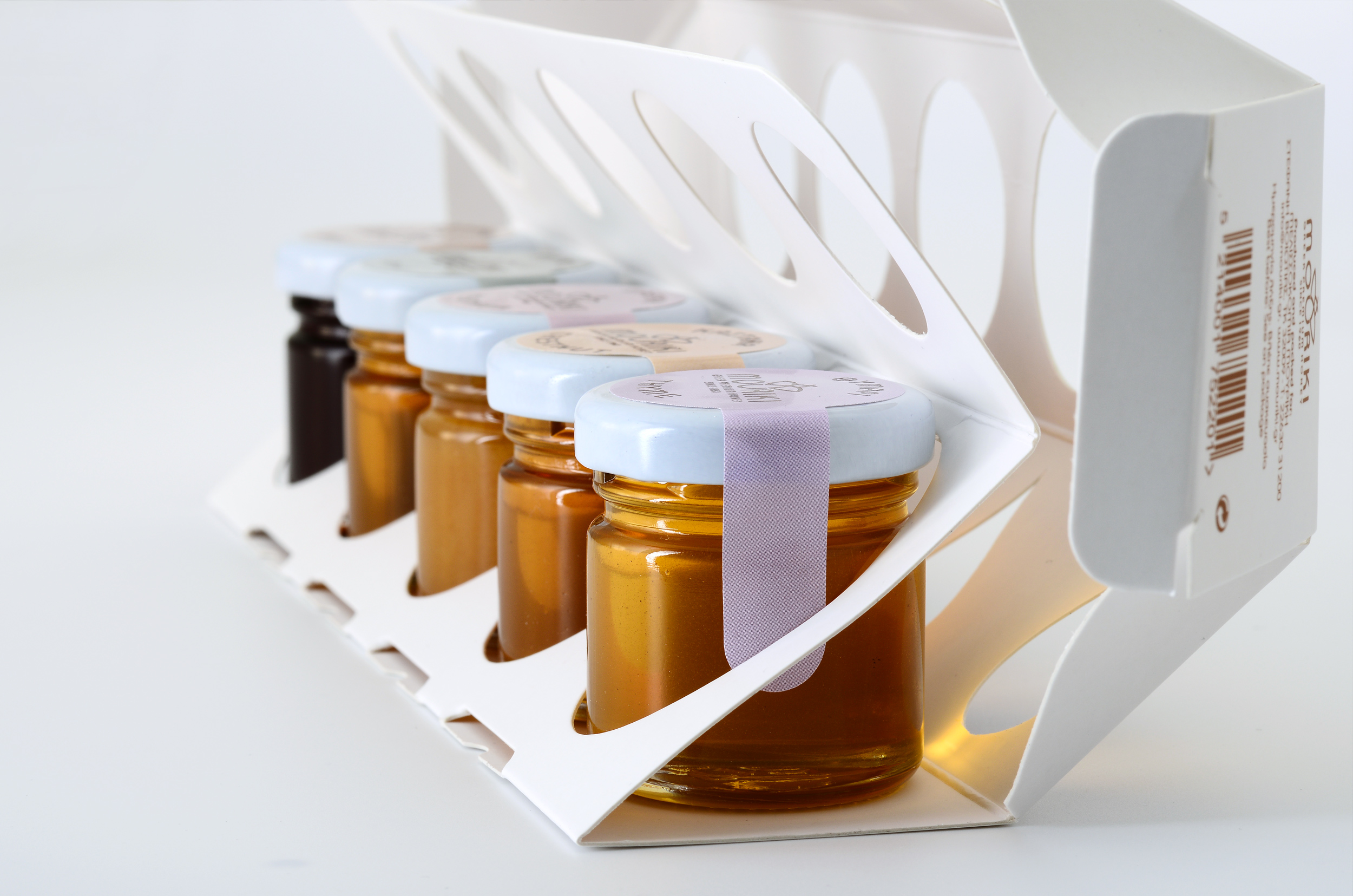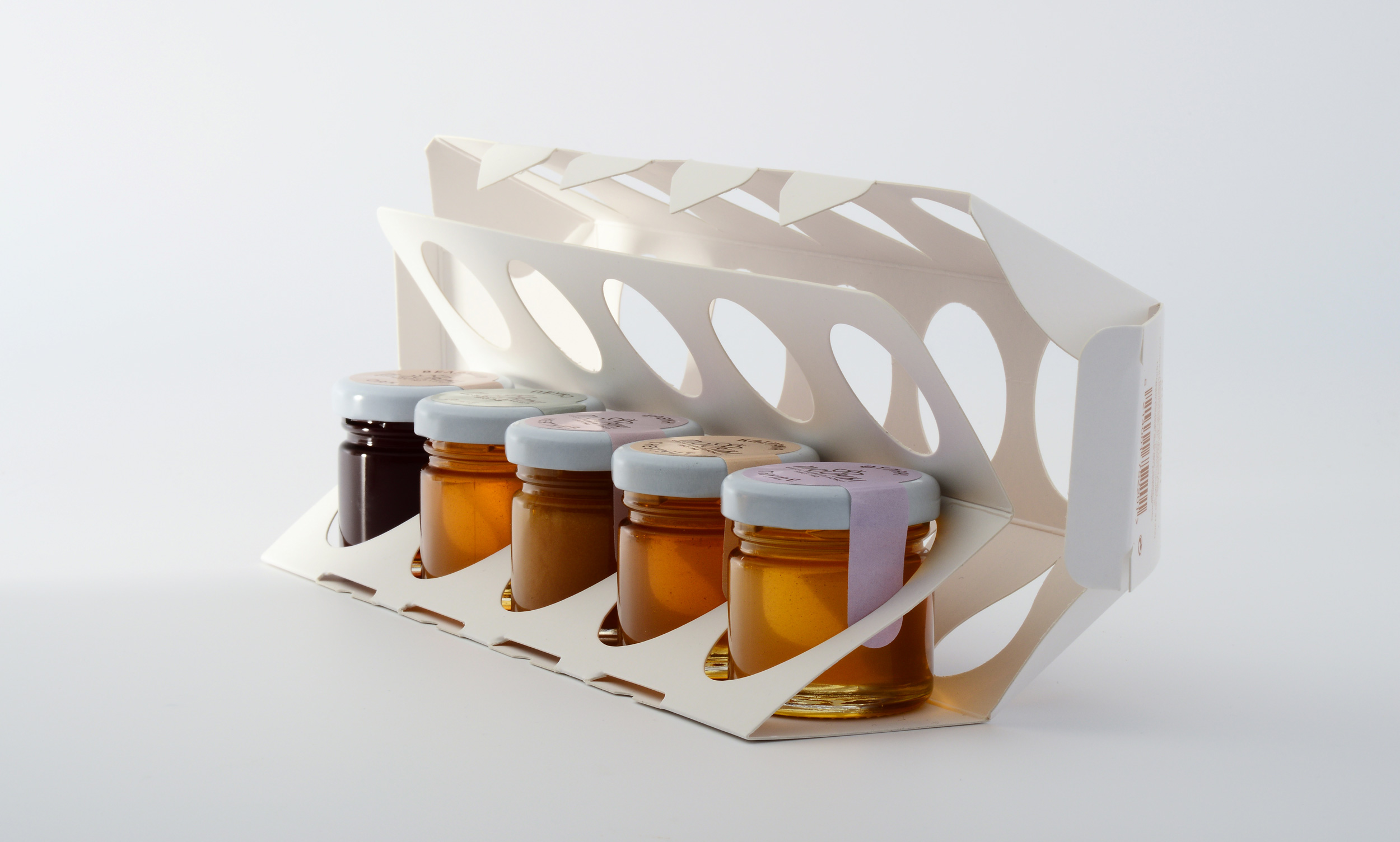 The design of 2 multipacks with three and five compartments was assigned to us for the secure transportation and storage, as well as the effective commercial management of small quantities of honey (40-gram jars). The result should be in line with the premium philosophy of the brand while being practical and flexible.